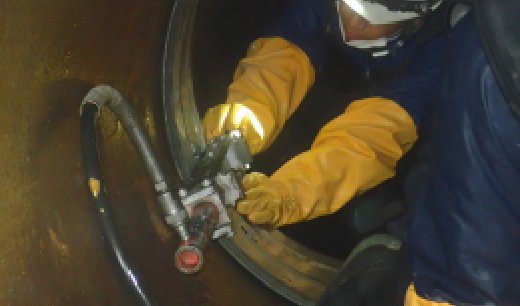 ![空気呼吸器を装備しての管内潜行目視調査]()